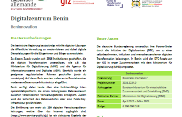 Das Vorhaben „Beninnovation“ unterstützt die beninische Regierung seit 2022 dabei, die digitale Transformation im Land voranzubringen. Das Ziel ist es, dass die beninische Regierung das Innovationspotenzial der lokalen Privatwirtschaft für die Digitalisierung ihrer Verwaltungsdienstleistungen erfolgreich nutzt. Dies gelingt über verschiedene Hebel: